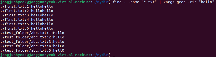 - 변환 : find . -name “*.txt” -exec grep -rin “hello” {} \;
